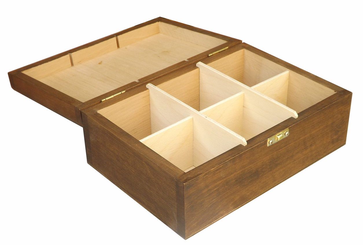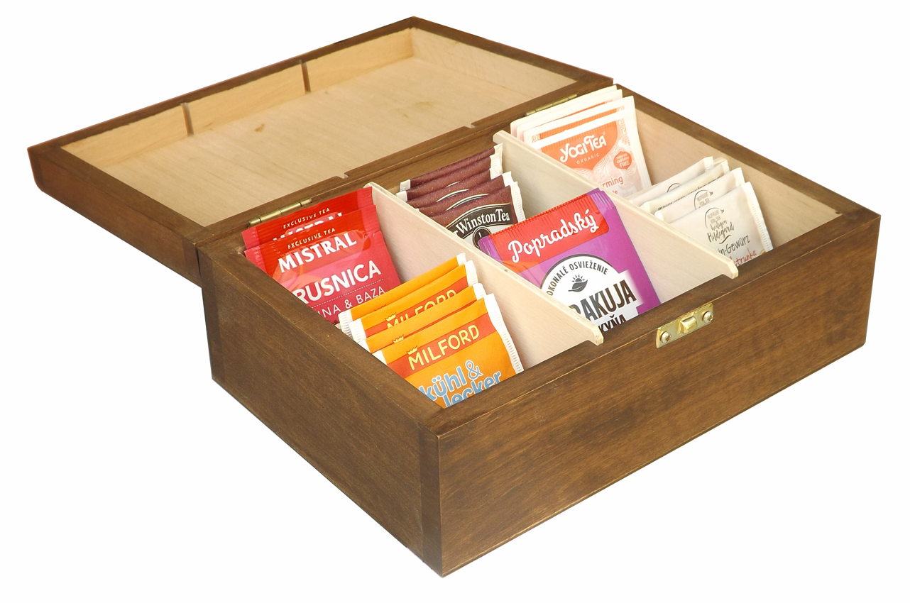 Drevená krabička na čaje je vyrobená z jelšového dreva v kombinácii s brezovou preglejkou (dno, veko a vnútorné delenie). Kazeta je primárne určená na uloženie 6 druhov vrecúškového čaju, čo je podporené vnútorným delením na 6 častí.