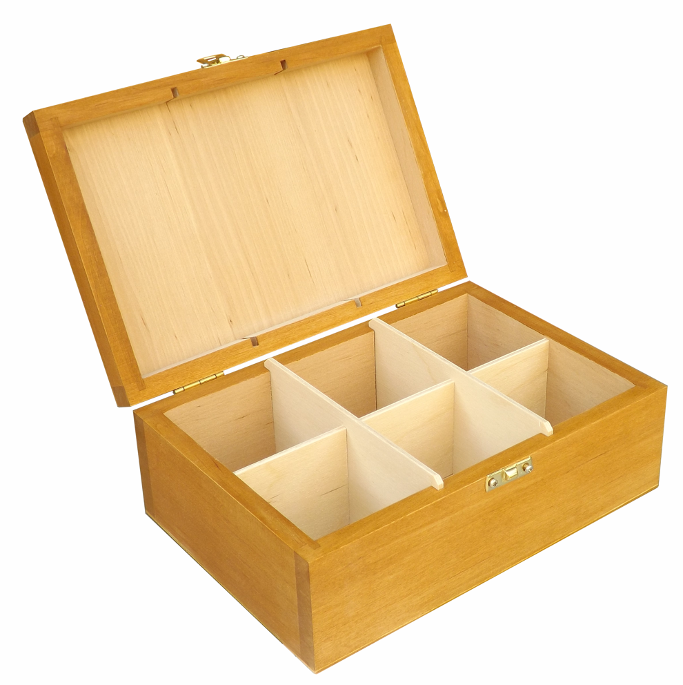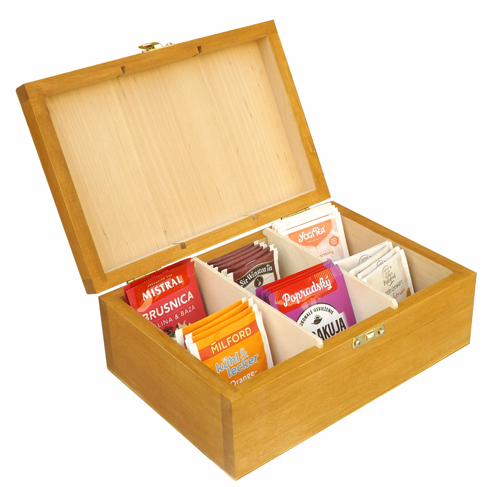 Drevená krabička na čaje je vyrobená z jelšového dreva v kombinácii s brezovou preglejkou (dno, veko a vnútorné delenie). Kazeta je primárne určená na uloženie 6 druhov vrecúškového čaju, čo je podporené vnútorným delením na 6 častí.