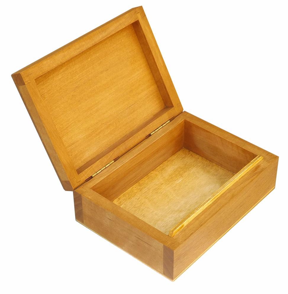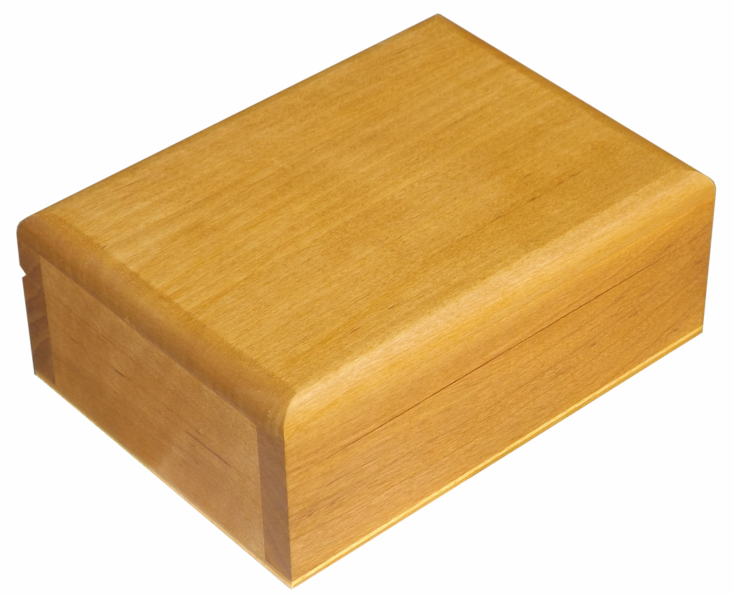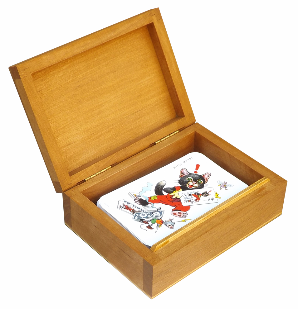 Kazeta je vyrobená zo jelšového dreva v kombinácii s brezovou preglejkou (dno a klapačka). Veko je vyrobené z masívneho dreva. To na rozdiel od mnohých konkurenčných výrobkov umožňuje jeho efektívne zaoblenie, čo samozrejme aj využívame. Kazeta je primárne určená na uloženie väčšieho balíčka kariet (napr. tarotových), to však nebráni jej využitiu na uloženie čohokoľvek. Povrchová úprava je robená tvrdým voskovým olejom v odtieni dub svetlý.