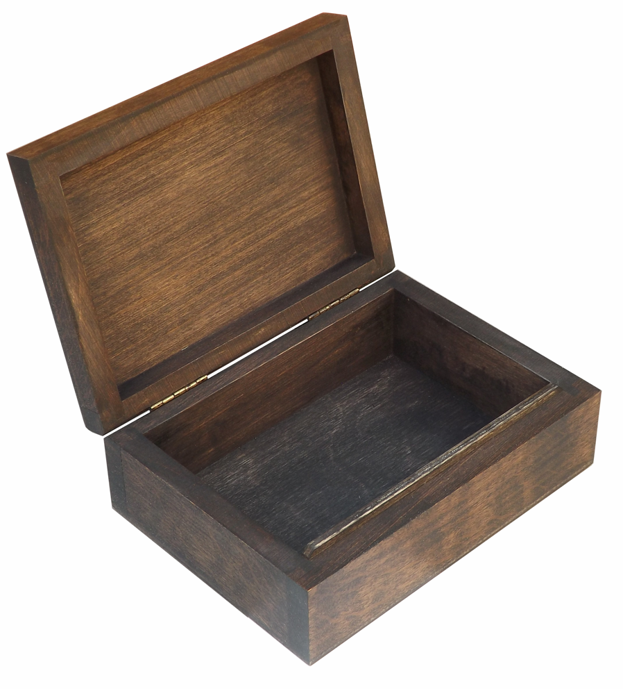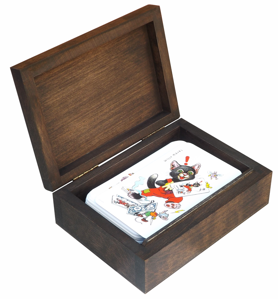 Kazeta je vyrobená zo jelšového dreva v kombinácii s brezovou preglejkou (dno a klapačka). Veko je vyrobené z masívneho dreva. To na rozdiel od mnohých konkurenčných výrobkov umožňuje jeho efektívne zaoblenie, čo samozrejme aj využívame. Kazeta je primárne určená na uloženie väčšieho balíčka kariet (napr. tarotových), to však nebráni jej využitiu na uloženie čohokoľvek. Povrchová úprava je robená tvrdým voskovým olejom v odtieni eben.