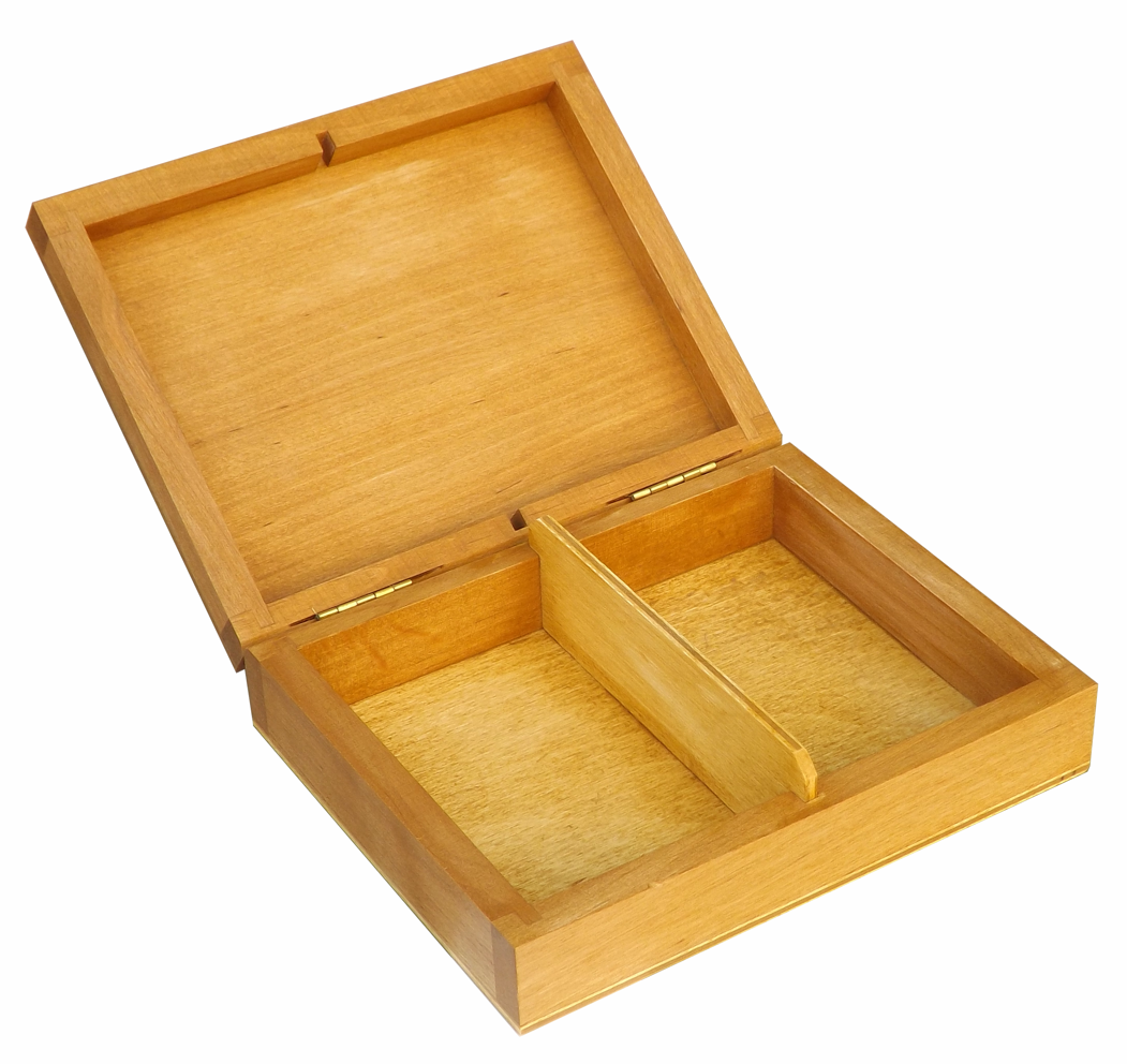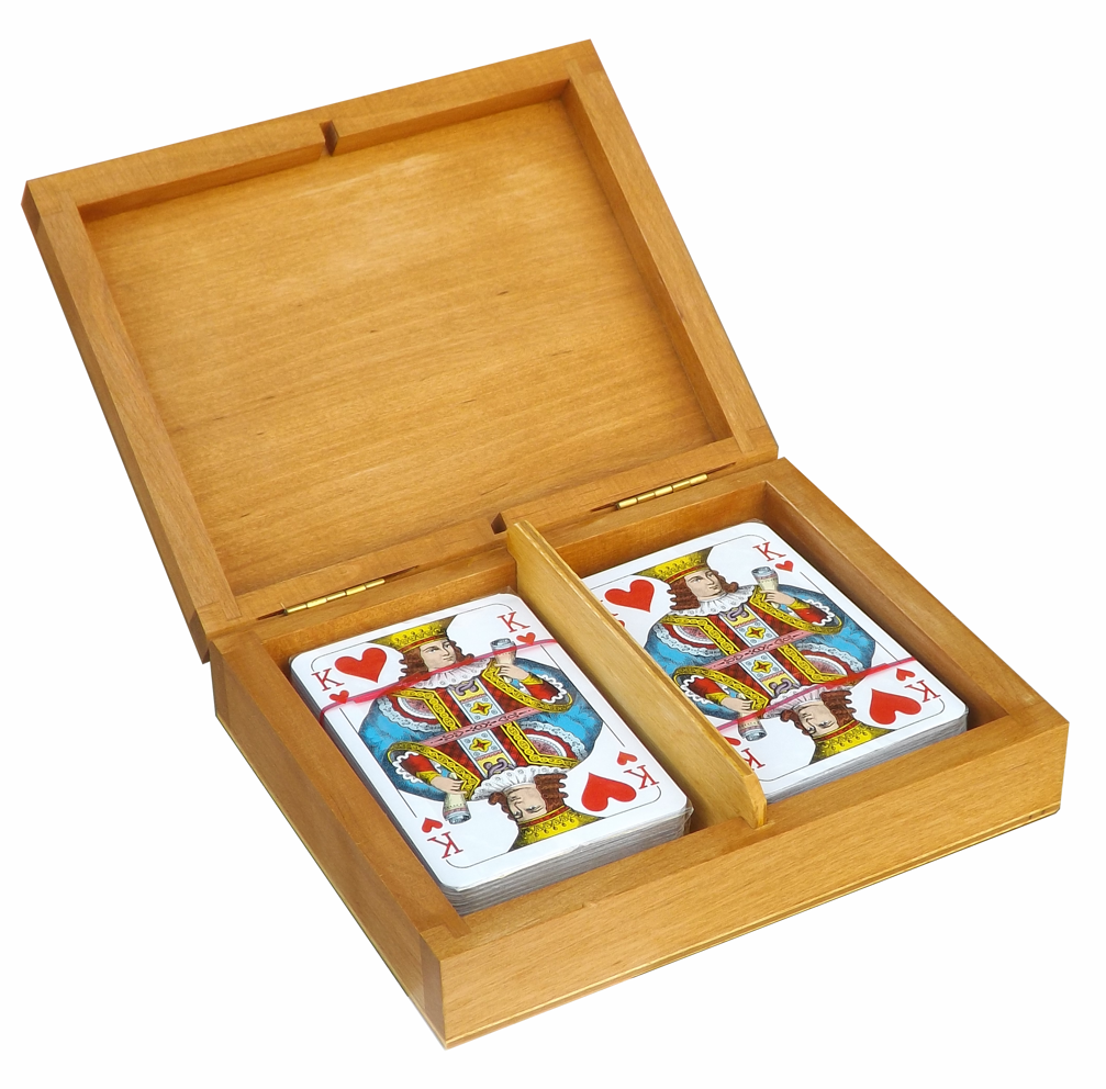 Kazeta je vyrobená zo jelšového dreva v kombinácii s brezovou preglejkou (dno a klapačka). Veko je vyrobené z masívneho dreva. To na rozdiel od mnohých konkurenčných výrobkov umožňuje jeho efektívne zaoblenie, čo samozrejme aj využívame. Kazeta je primárne určená na uloženie 2 balíčkov sedmových kariet. Nič však nebráni jej využitiu na uloženie čohokoľvek. Povrchová úprava je robená tvrdým voskovým olejom v odtieni dub svetlý.